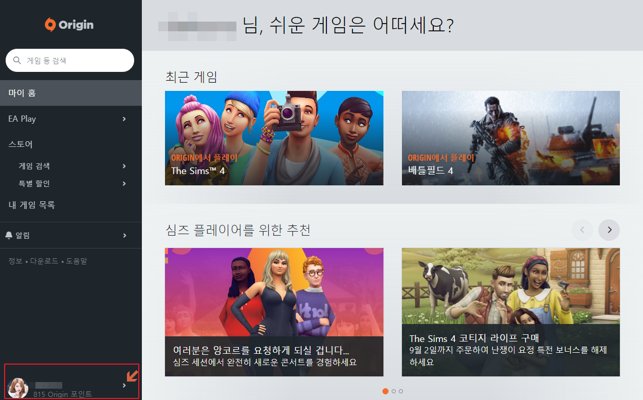 1. 오리진 홈페이지 또는 오리진 클라이언트의 좌측하단에서 프로필의 「 > 」 를 누릅니다.