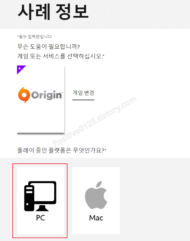 2. 사례정보라는 창이 활성화되면 자신의 컴퓨터 플랫폼을 선택합니다. 저는 윈도우니까 윈도를 선택하겠습니다.