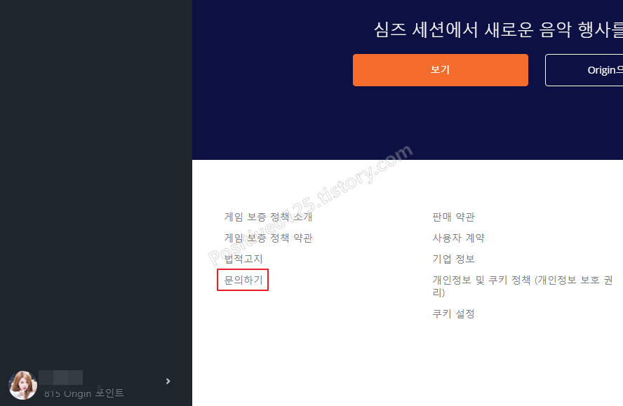 1. 오리진 홈페이지 또는 오리진 클라이언트의 좌측 중앙의 문의하기를 누릅니다.