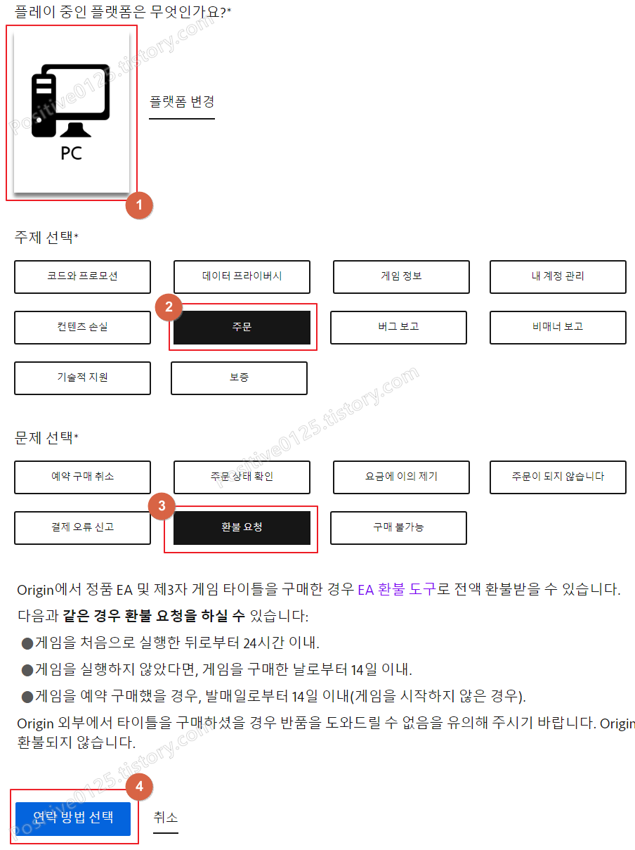 3. 플랫폼 선택(1)후 주제 선택이 나오면 주문(2)을 선택하고, 문제 선택 항목이 나오면 환불 요청(3)을 누릅니다. 그 후 마지막으로 하단부의 연락 방법 선택(4)을 누릅니다.