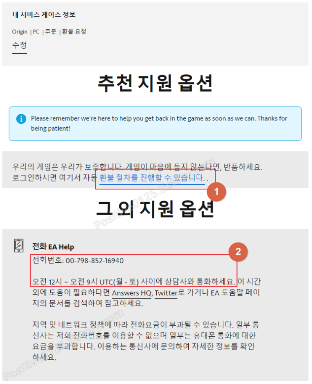 그 외의 방법으로는 바로 전화 상담을 하는 것입니다. 전화번호 080-822-1350 또는 02-822-1350이라고 합니다. EA코리아의 전화번호이고 EA코리아에 권한이 그리 많은 것이 아니라서 실질적인 도움이 안 될 수도 있지만 전화상담을 시도해보는 것도 좋은 방법입니다.