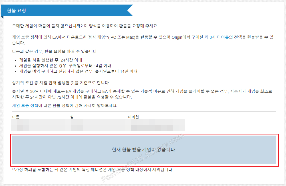 - 14일이라는 기간은 스팀또한 동일합니다. 스팀은 2시간 이내 그리고 14일 이내에 환불 요청을 하면 들어주게 되는데 오리진의 경우 플레이하지 않은 상태에서 14일 이내라고 생각하시면 됩니다.