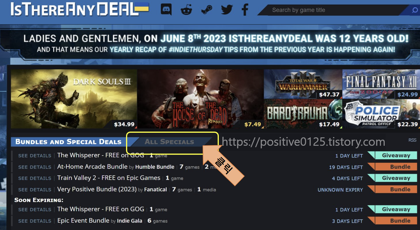 해당 스팀 할인 게임 사이트를 접속하였으면 'All specials'라는 버튼을 클릭합니다.
