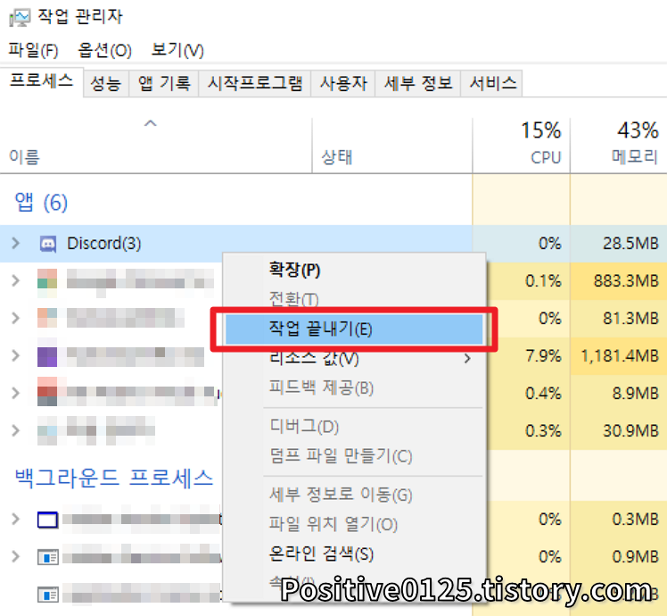 실행되고 있는 디스코드를 찾아서 마우스 우클릭으로 작업 끝내기를 눌러줍니다.
